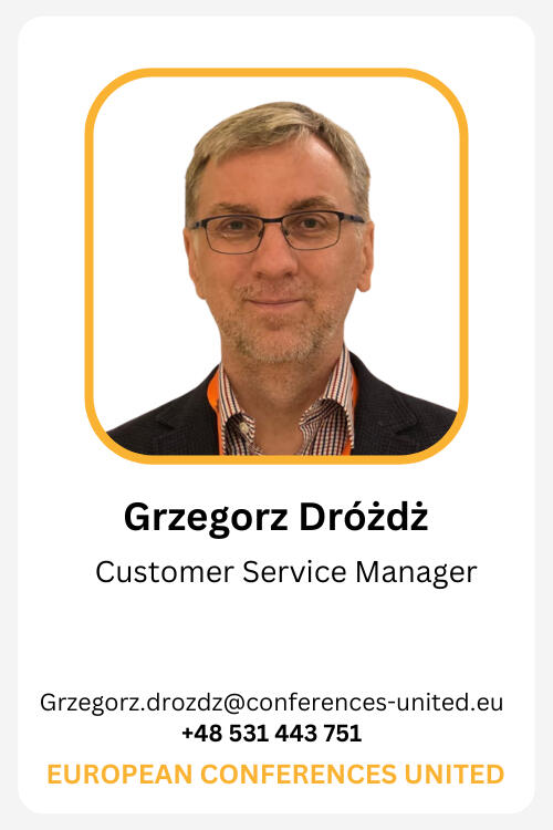 https://conferences-united.euEuropean Conferences United Sp. z o.o. z siedzibą: ul. Ludwinowska 7/16, 30-331 Kraków; wpisana do Rejestru Przedsiębiorców prowadzonego przez Sąd Rejonowy dla miasta Kraków, XI Wydział Gospodarczy Krajowego Rejestru Sądowego w dniu 15 listopada 2002 roku pod numerem KRS 0000132734; NIP 6762228354; kapitał zakładowy 50.000,00 PLN.